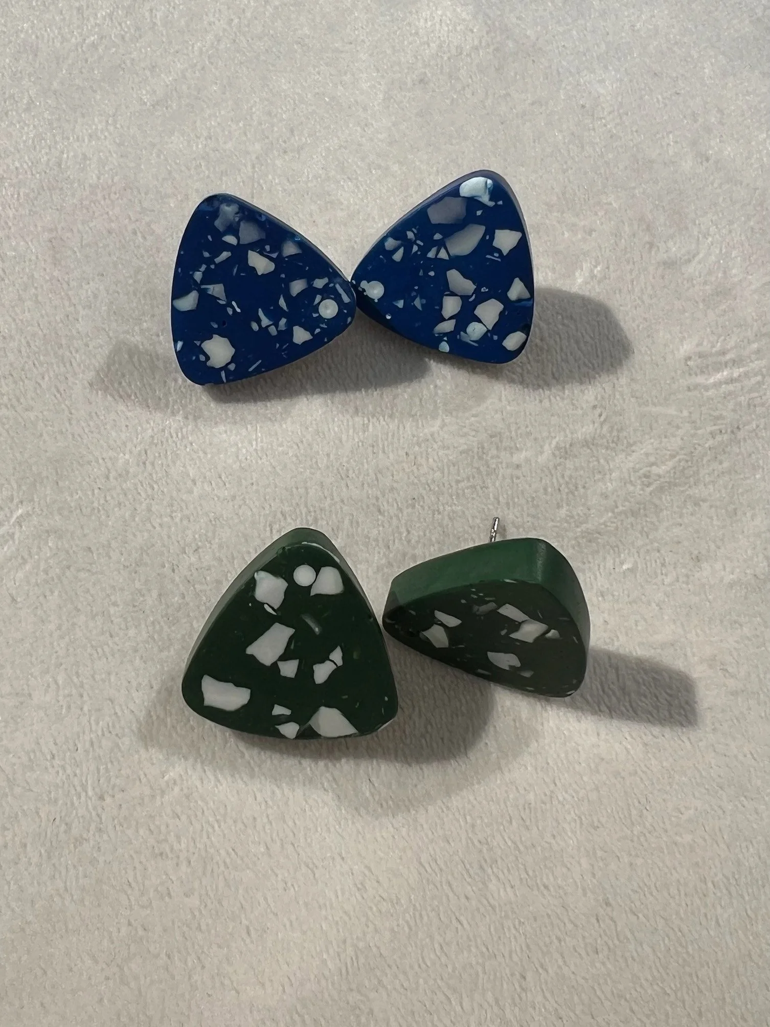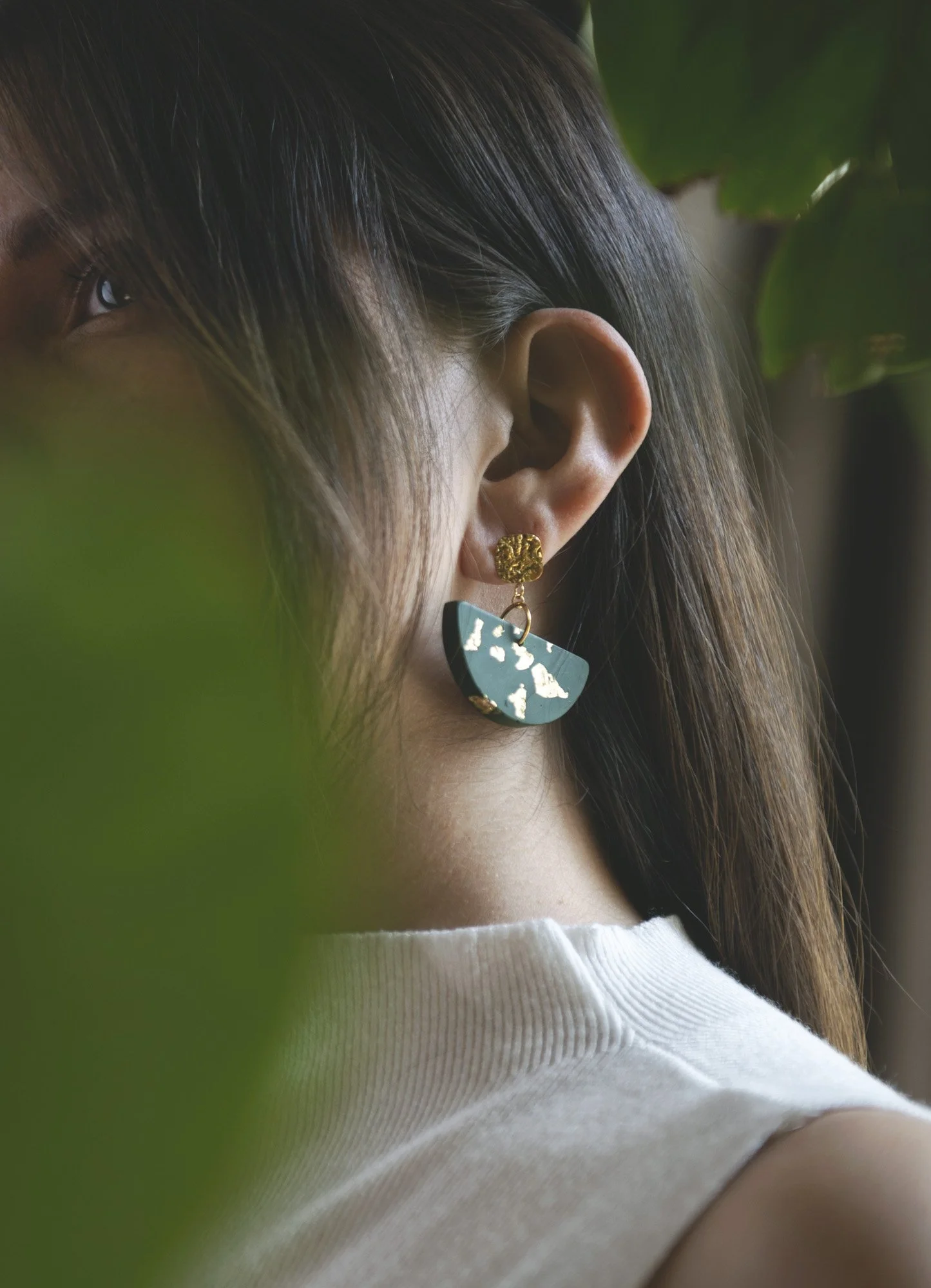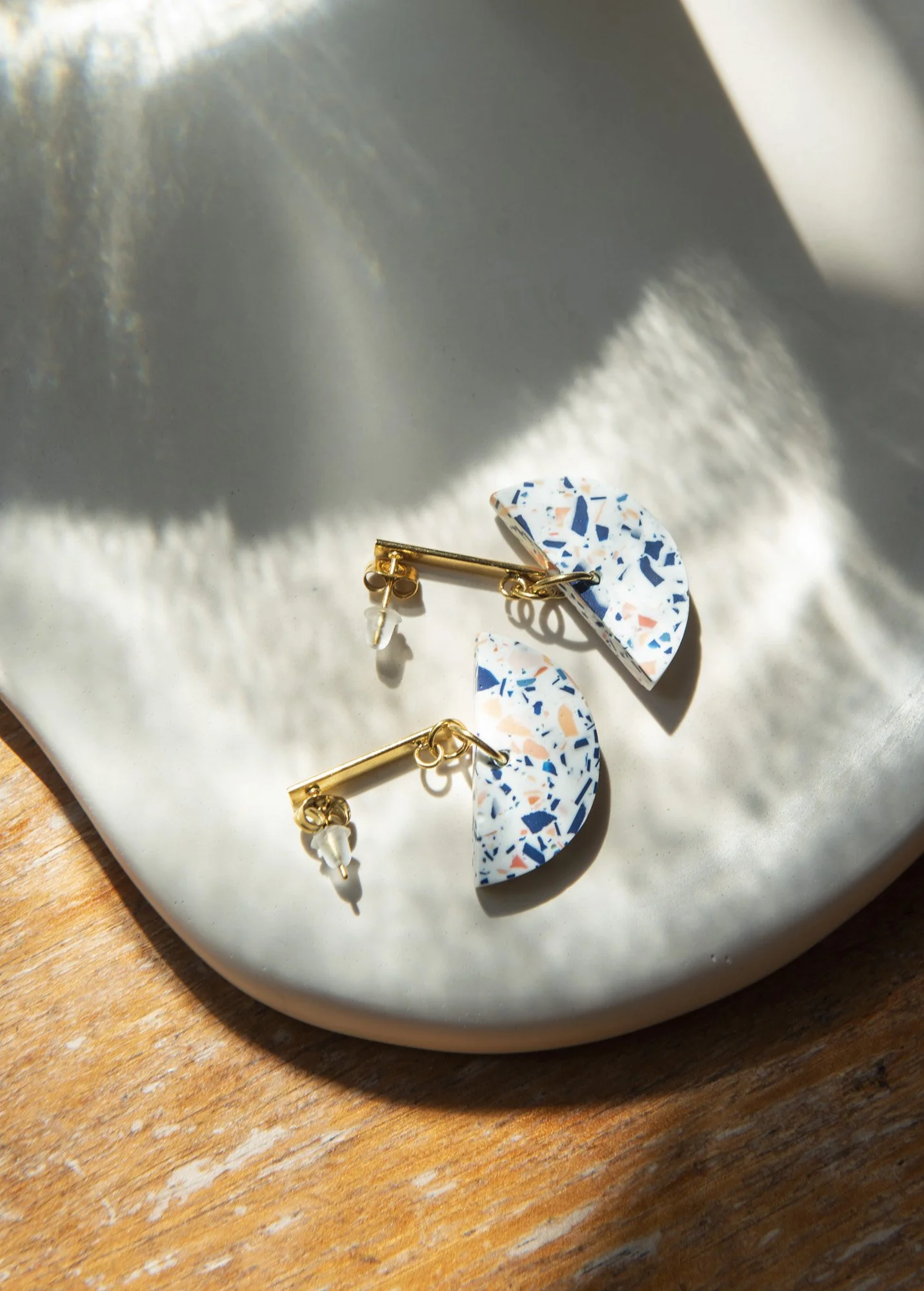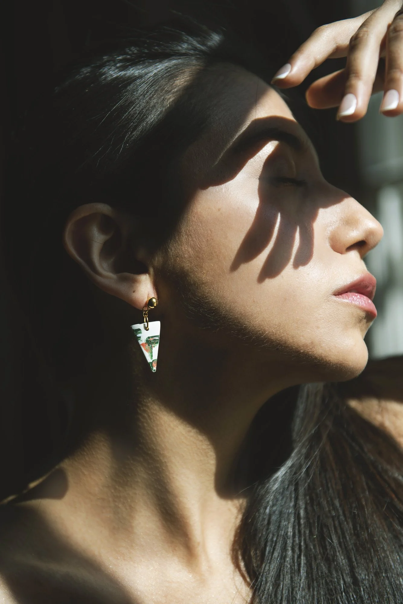 The earrings in (im)perfection reflect organic forms, semicircles and triangles and a hand-sculpted feminine face that holds its own story. Each piece is made with care, celebrating the handmade and the authentic — hand-painting and terrazzo. Because no two are the same. Because what’s real is what’s truly unique.